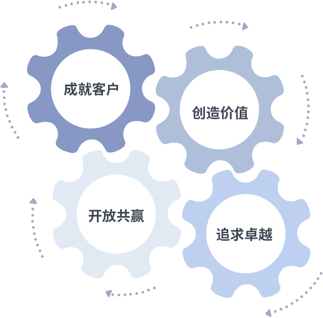 成就客户是一切决策的出发点,,创造价值是衡量所有工作的标准,,,追求卓越是我们做事做人的态度,,,开放共赢是我们的格局也是最终的结果。。。价值观的齿轮环环相扣,,推动着组织里的每个人不断向前。。